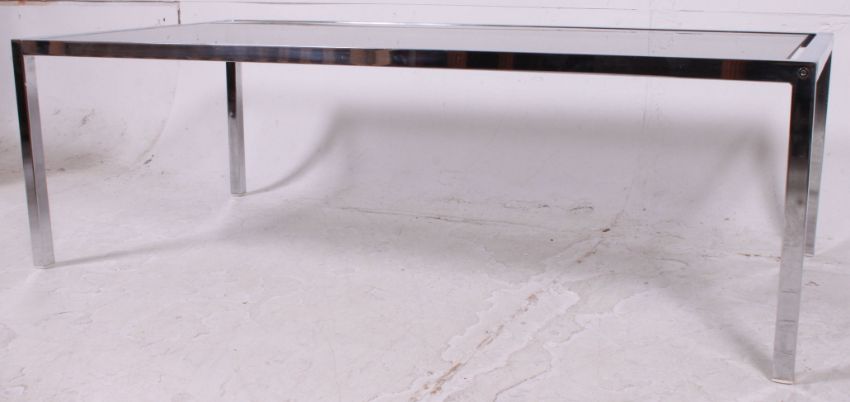 A 1970's retro large chrome and smoked glass rectangular coffee table raised squared chrome tubular frame. Measures: 39cm x 122cm x 61cm.