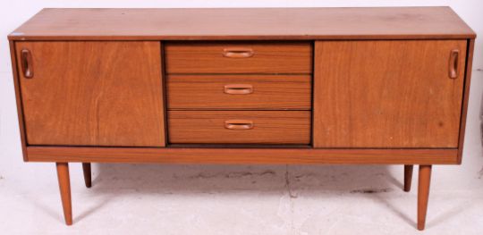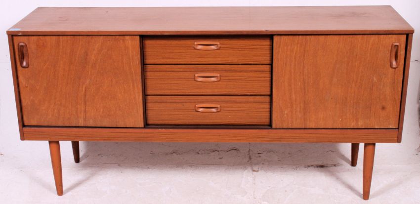 A retro 1970's teak veneer low sideboard dresser raised on tapered supports comprising cupboard and drawers to the body. Measures: 73cm x 152cm x 41cm.