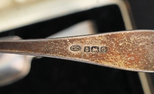 A cased silver hallmarked christening set bearing hallmarks for Birmingham to each. The spoon being a different date letter and maker. Weight 31.6g