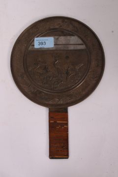 A 19th century bronze Chinese oriental hand mirror. Intricate decoration to the rear of the mirror, with signature to right hand side. Decorated with a stylised oriental scene, with original wound wicker handle.