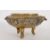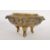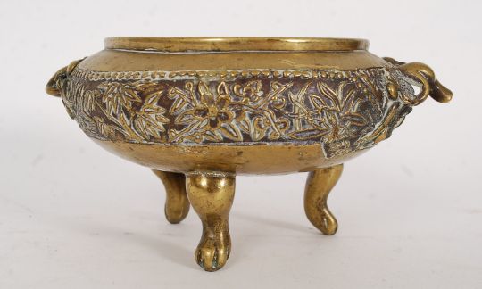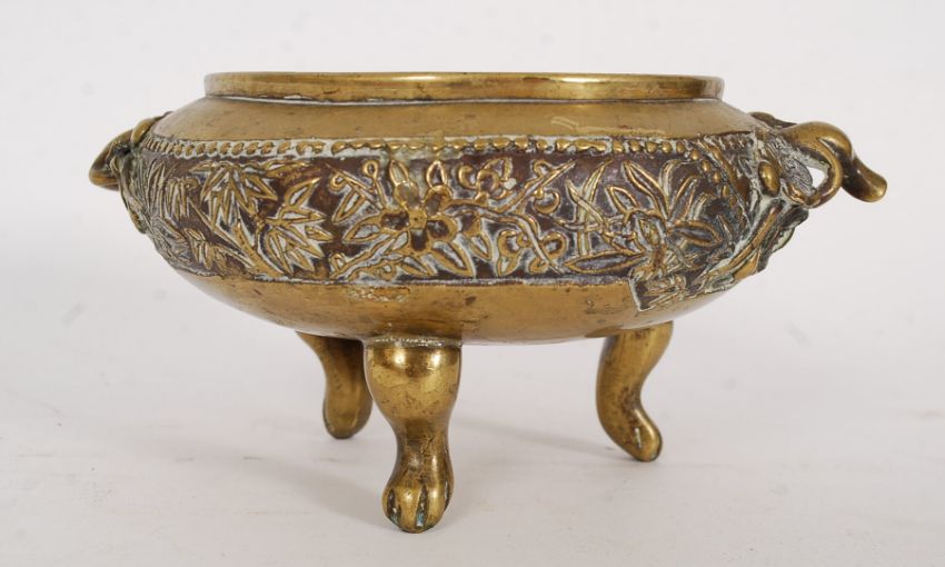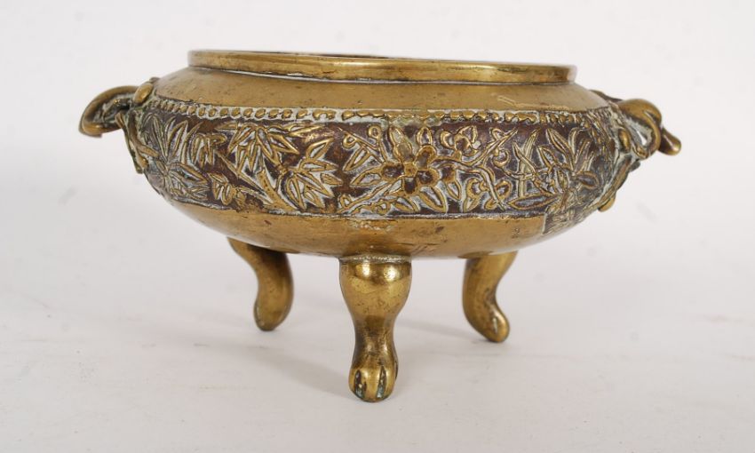 A large Chinese bronze / brass ding shaped censer. Bearing a Xuande ? six character mark impressed to the base having a globular body with a pair of leaf stylised looped handles, on three tapered stump feet