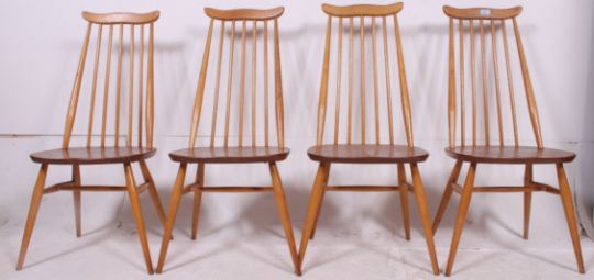 A set of 4 Ercol quaker pattern beech and elm dining chairs raised on turned legs united by stretchers, panel seats and arched back rests. matching 5 leg dining table in lot 1186. Measures: 97cm x 43cm x 41cm.