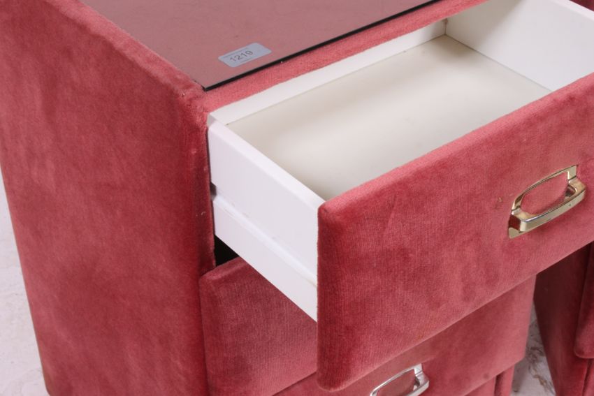 A retro / vintage 1970's / 1980's pair of upholstered pink velour fabric bedside chest of drawers / cabinets. Each pedestal with a bank of drawers having handles to centre. Measures: 60cm x 41cm x 41cm.
