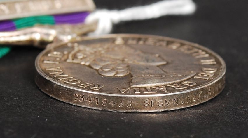 Elizabeth II General Service Medal with Cyprus bar, original green and purple ribbon. Being awarded to; 23419438 Signalman NFS Whatley R.Sigs. Engraved to rim.