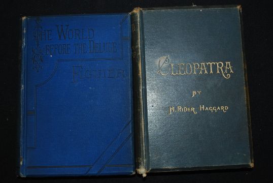 Cleopatra, H. Rider Haggard. Published by Longmans, London 1889. 1st edition. Blue boards with gilt notation w/plates. Together with The World Before the Deluge By Figuier, Bristow 1869, Newly Edited & Revised. Blue Boards, Black Notation.