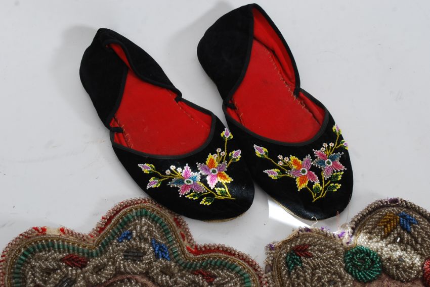 A pair of woodland 19th century American Indian beaded roundels together with a pair of beaded slippers circa Victorian period