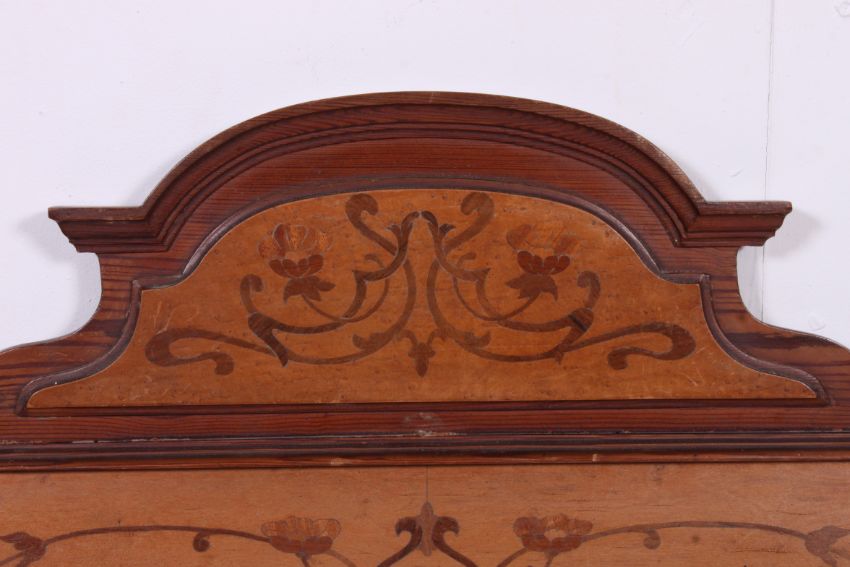A late 19th cenutry Pitch Pine Art Nouveau 3/4 bed having marquetry inlaid details. Complete with rails. Matching single wardrobe in lot 1343