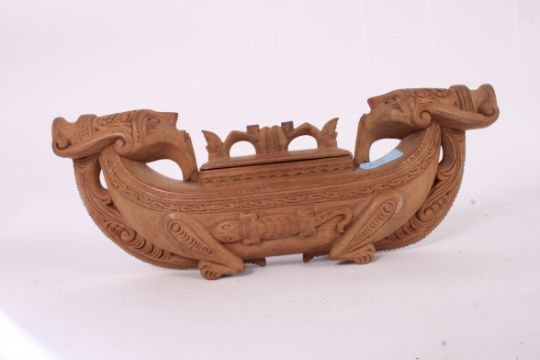 A carved wooden Indonesian feather box in the form of a boat complete with the lid