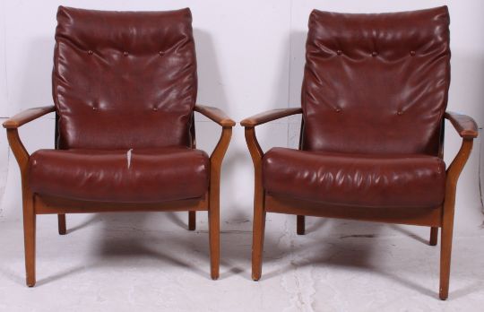 A superb pair of matching early twentieth century low lounge/ arm chair, with wooden show frame. Leatherette back and seat pads, with button detailing.