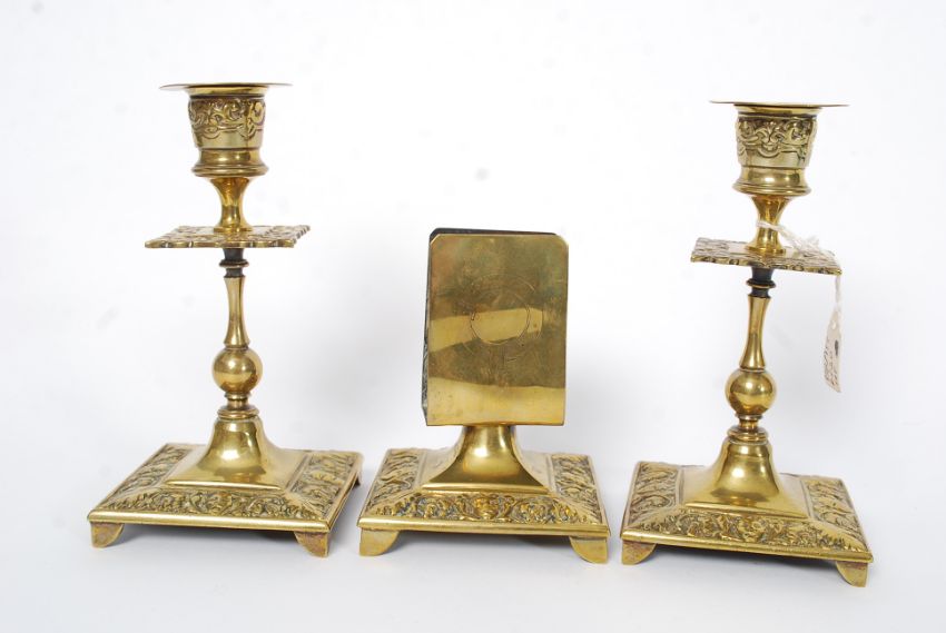 A pair of 19th century brass candlesticks together with the matching brass matchbox holder having central buckle and belt motif to centre. 16.5cm H 8.5cm W
