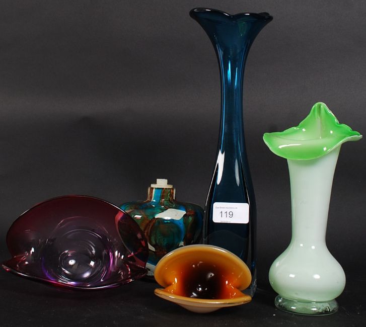 A collection of studio art glass from the 20th century to include stem vases, handkerchief vases, coloured glass etc