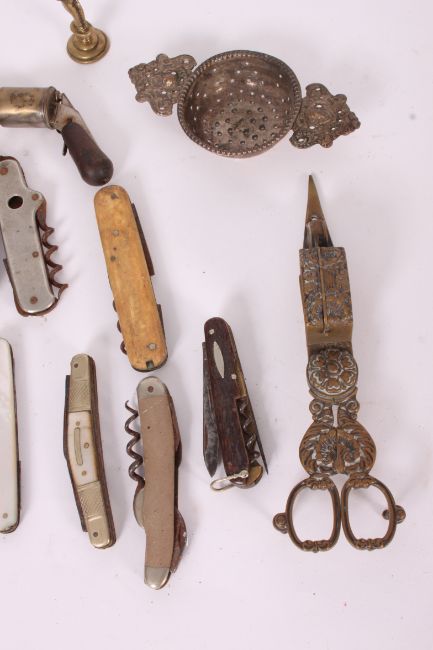 A collection of pen knives to include mother of pearl, metal handled etc together with a pistol pencil, candle snuffers, pipe temper etc