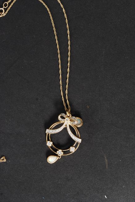 A 9ct gold opal and diamond pendant, on a 9ct gold chain. Weight: 4.1g.