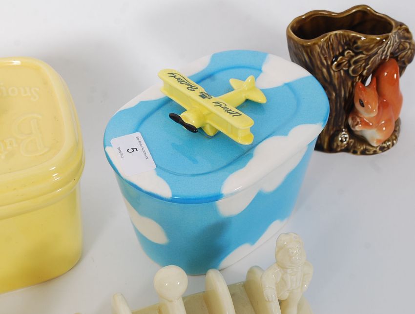 Two lots of Utterly Butterfly butter dishes along with a Butterlicious butter dish and a pair of Lurpack toast racks. 13cm H 17cm W