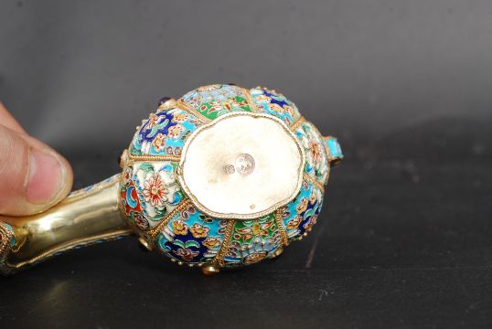 A highly detailed Russian white metal (tested as silver ) and enamel decorated Kovsh. Weight: 98g.