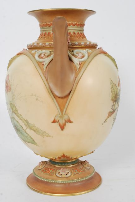A 19th century large Royal Worcester two-handled vase. The ovoid body decorated with flowers / spray by Edward Raby. Ivory blush ground being outlined in raised gilding. To the reverse a further floral spray with poppies. Above having scrolled pierced handles with waisted neck. Shape 1320 / Rd No 113708. 43cms high