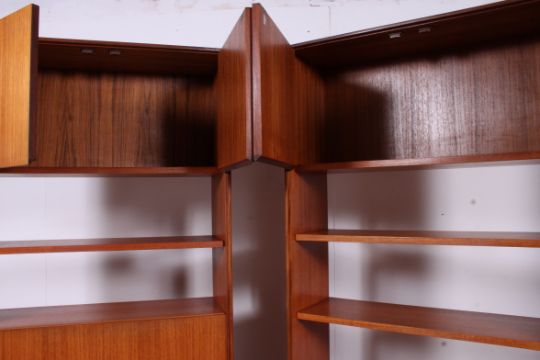 A pair of G-Plan teak wood upright bookcase / cabinets. Each with cabinet bases having shelved upright rears. Each dismantling to 2 pieces. Measures: 198cm x 76cm x 46cm.