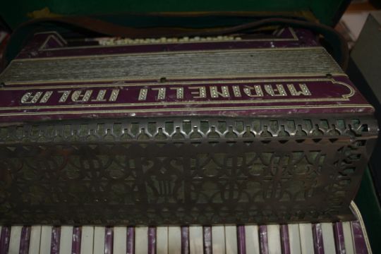 MARINELLI ITALIA ACCORDION SIMILAR TO PAOLO SOPRANI. A lovely piano accordian / concertina complete with Its original hard carry case. Beautiful pearlescent / mother of pearl blackcurrant colour. In great condition for its age with only some minor restoration work needed to a couple of the button keys.
