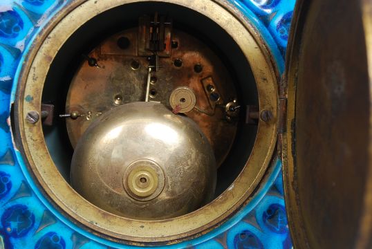A French majolica 8 day mantel clock in an Aesthetic Movement porcelain Chinese influenced case having fu dog handle masks to either side. The French brass 8 day movement set within, striking on a bell.