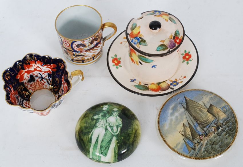 A mixed lot of china to include two pot lids, Japanese conserve pot and 2x Victorian Imari pattern cups.
