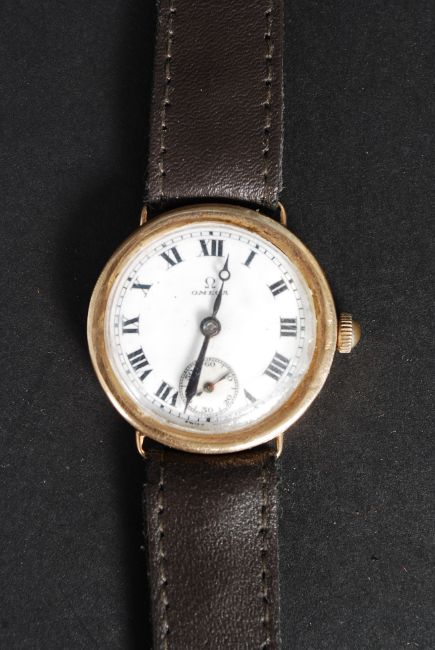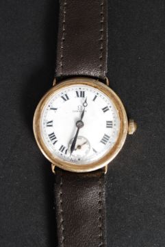 A 1930`s 9ct gold Omega wristwatch with roman numerals and subsidiary seconds dial, the fifteen jewel movement numbered 6950438, the case hallmarked Birmingham stamped 375. Set on a leather strap