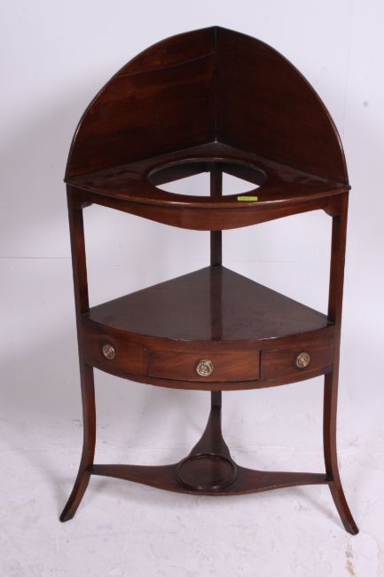 A Georgian mahogany corner washstand having circular bowl recess having large oversized splashback