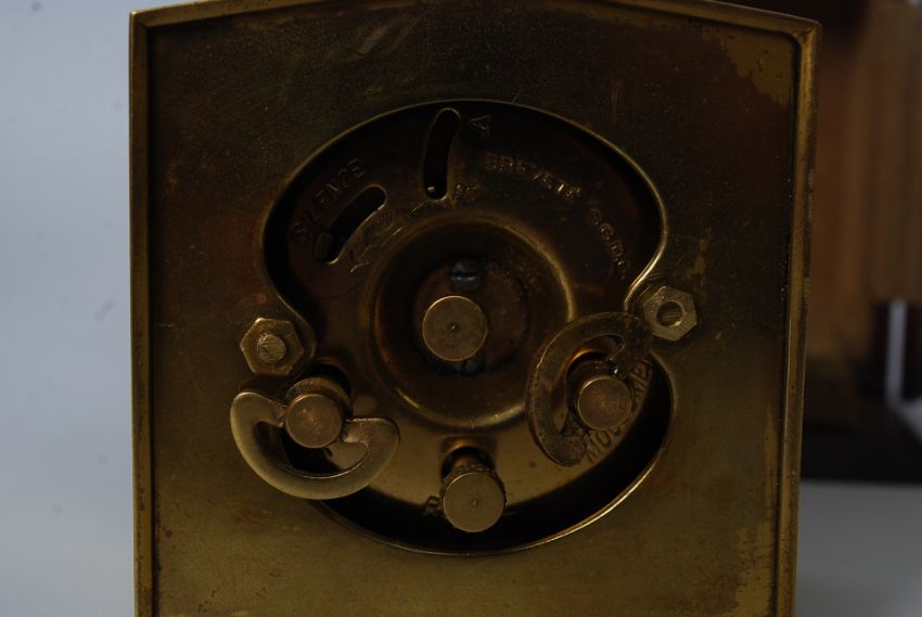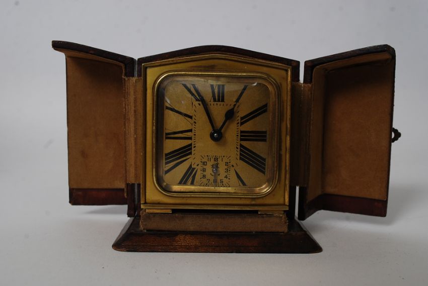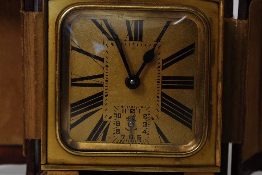 A good early 20th century brass travel clock stamped Brevette SGDG complete with the leather original carry case.