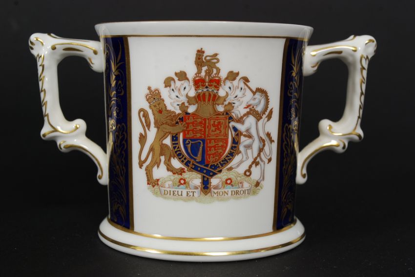 A Royal Crown Derby limited edition Golden Jubilee twin handled loving cup by Hugh Gibson being a limited edition no 431/2000 specially commissioned by Govier's of Sidmouth bearing painted monograms having original box and certificate of authenticity. 8cms high