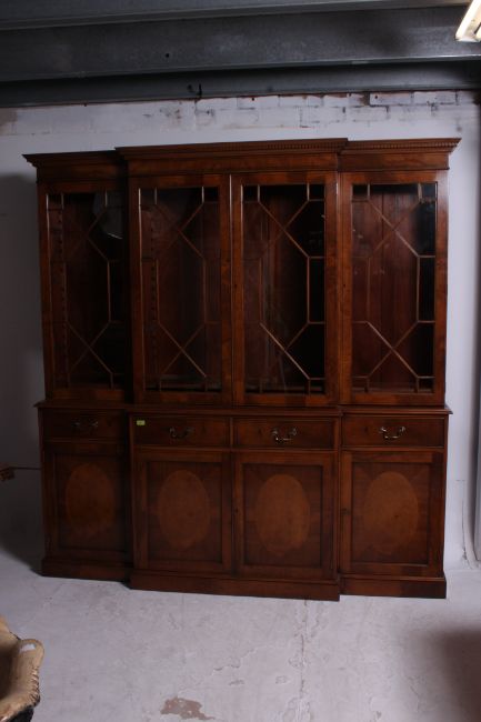 An excellent burr walnut regency style breakfront library bookcase cabinet. Raised on a plinth base having a series of cupboards and short drawers. Above an astragal glazed 4 sectional bookcase cabinet with flared cornice atop. Dismantles to 2 parts for ease of movement. H210 W210 D47cm