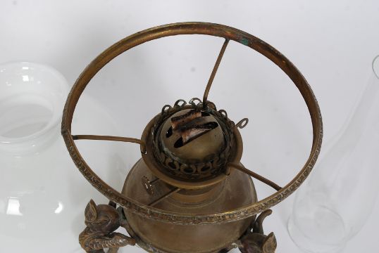 A Victorian brass table oil lamp raised on three winged griffin supports
