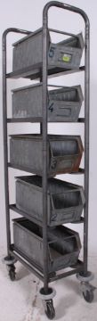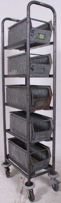 A vintage retro industrial metal tote trays / bins numbered 1 through 5 all stacked neatly on a purpose built trolley.