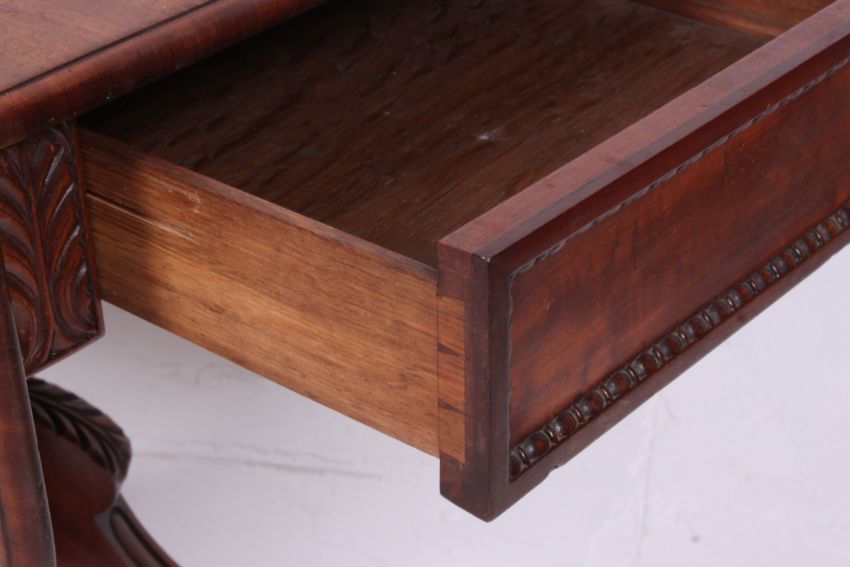 A Georgian 19th century mahogany sofa table. Raised on reeded quadruped base with brass claw castor feet. Above a drop side table with single end frieze drawer