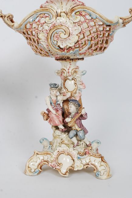 A pair of continental porcelain Italian centrepieces. The trefoil bases with applied boy and girl playing music having ribbon pierced ovoid bowls above. Impressed marks to base H 39cm