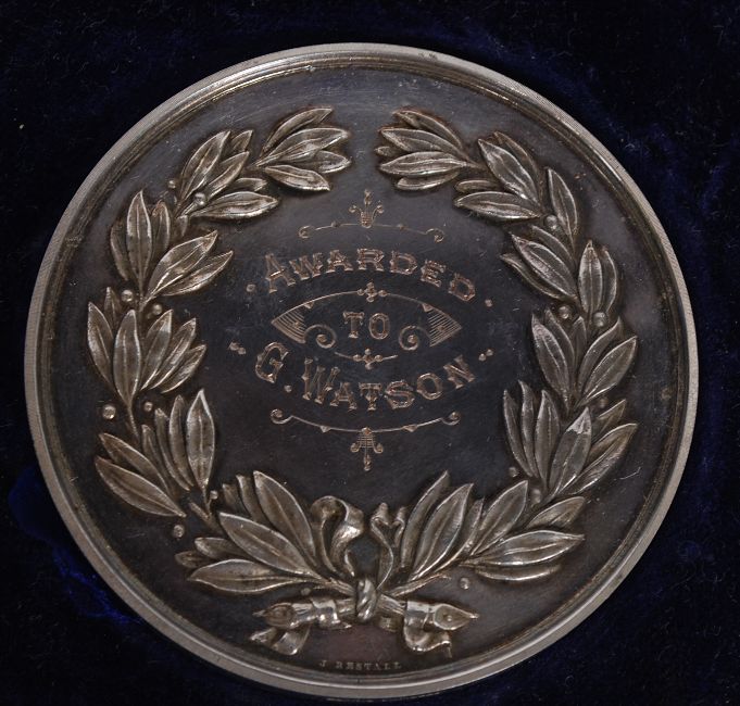 A silver Bristol Exhibition coin being awarded to G Watson 1911. Marked to side Sterling Silver, complete in the presentation case. The coin by artist J. Restall