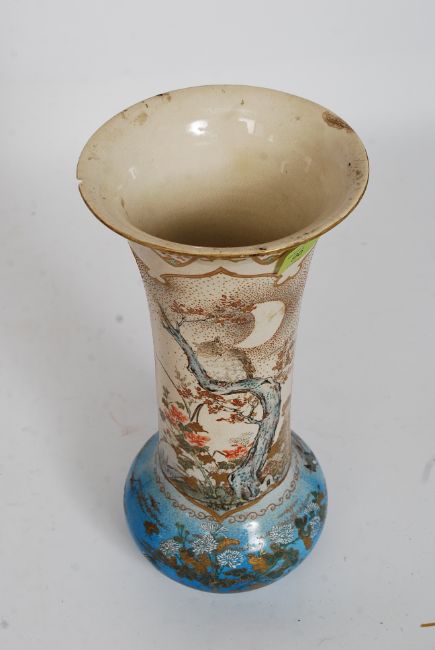 Large Japanese Satsuma vase, with early repair, of baluster form with trumpet neck decorated on the cream ground / blue base with an owl perched in a tree against the moon. No marks
