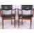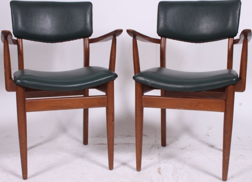 A pair of vintage 1970's teak wood retro mid century carver office dining chairs with shaped elbow rests having original padded seats
