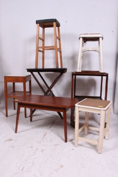 A mahogany table together with a side table, folding table, 2 stools and a serving trolley. it is 74cm in height 43cm in width and 83cm in depth.