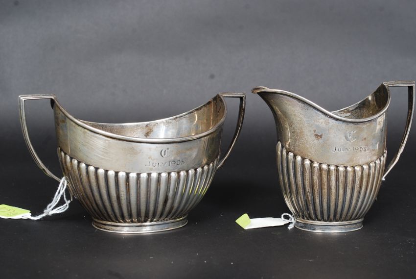 A silver hallmarked sugar bow and creamer by Goldsmiths & Silversmiths Company 112 Regent Street London. Hallmarks for London 1904 / 1905, each item with chased monogram and date notation to sides July 1905.