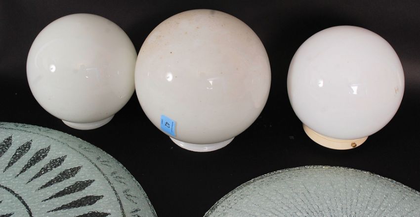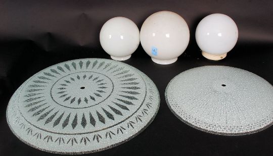 A collection of five retro glass light shades / fittings, two being decorative designs, and three bulb shaped shades