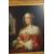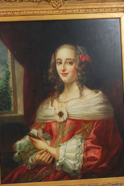 A large 19th century style oil on canvas painting - portrait 3/4 study of a lady set within an oversized gilt wood frame with display light fitted atop. Measures: (frame) 111cm x 95cm x 9cm. (canvas size) 75cm x 59cm.