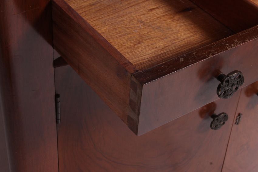 A 1930's Art Deco walnut cocktail drinks cabinet. The top with metamorphic action having lined interior. Beneath a cupboard with appointed drinks bottle interior etc. measures 114 by 86