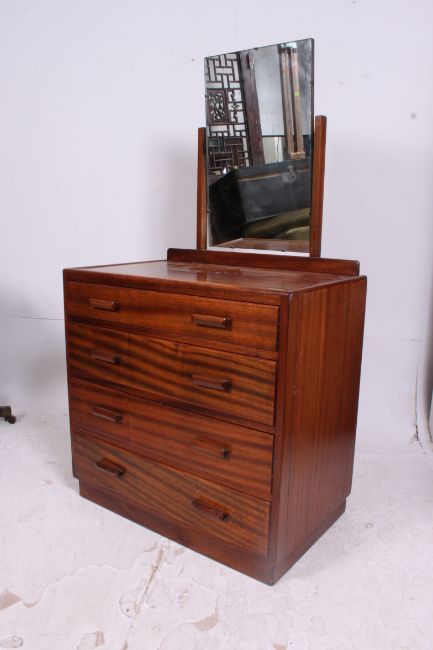 A 1940's post war Heals style mahogany dressing chest of drawers having bank of drawers to chest with mirror atop. h=73 by w=76 by d=47