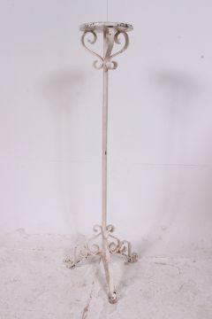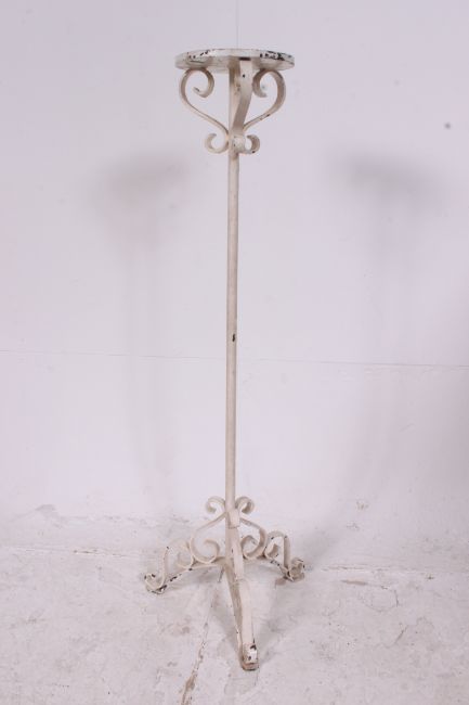 A 20th century rococo cast iron white painted shabby chic torchere plant stand having terraced top.