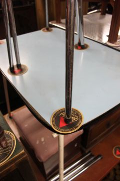 A retro 1950's tubular metal painted and formica kitchenette dining table together with 2 matching dining chairs ( see illustration ) h=71 by w=56 by d=90