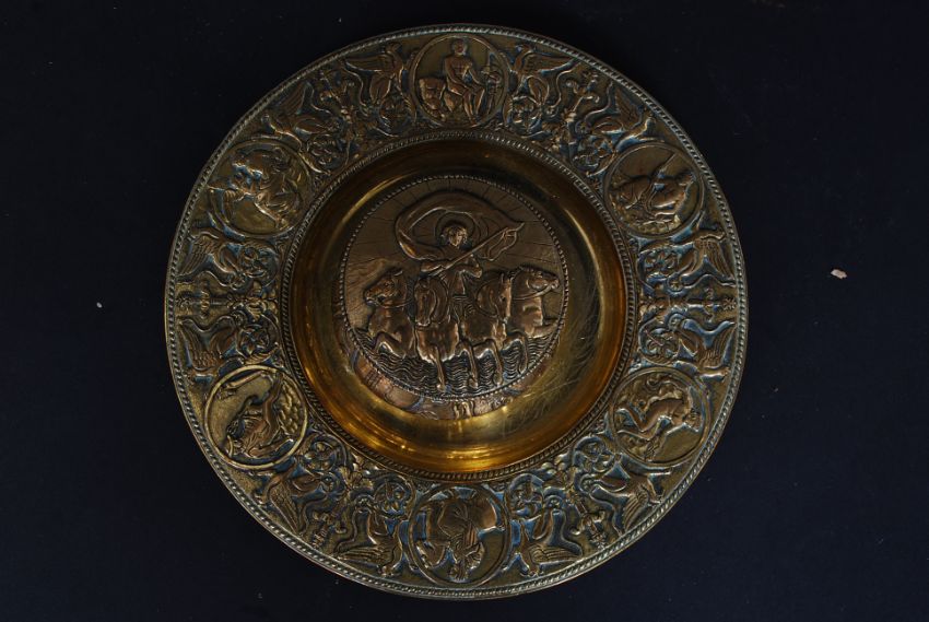A decorative cast gilded copper circular desk tidy and inkwell moulded in relied with mythical scenes to centre and borders