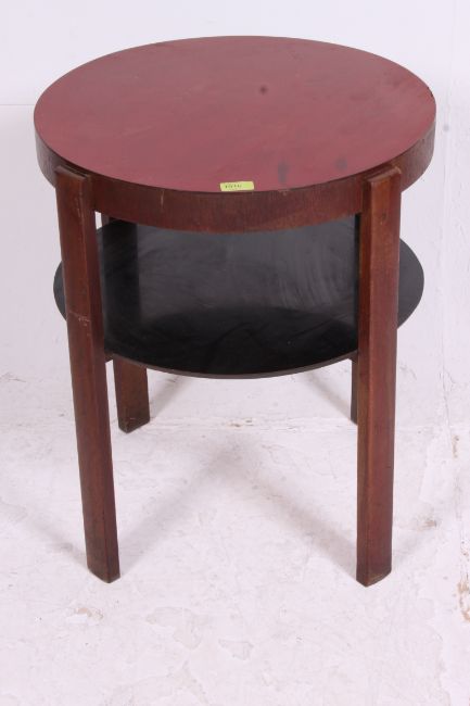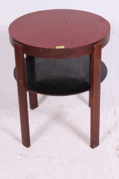 A 1950's post war Art Deco red formica top circular lamp table having secondary tier to the underside
