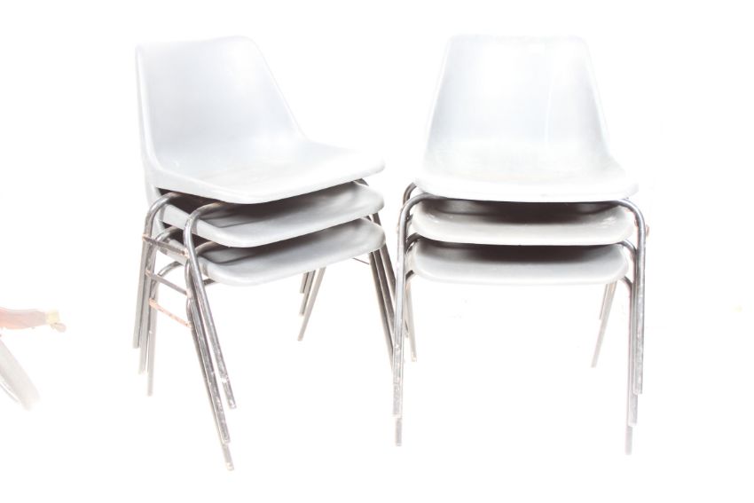 A set of 6 retro plastic Hille school / office Industrial stacking chairs, in black, on tubular metal legs, each stamped to underside for Hille Furniture. h=112 by w=46 by d=39