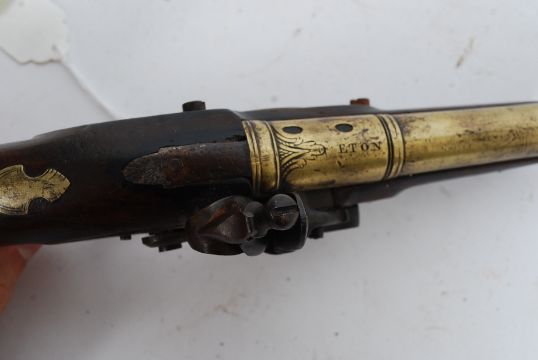 A Georgian flintlock brass cannon barrelled pistol. Proof marks and 'Eton' stamped to the barrel with brass escutcheon and furniture. ' Nock' stamped to the lock.