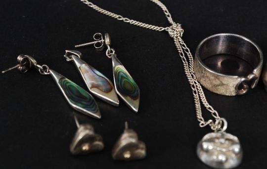 A collection of silver to include ladies rings and earrings. Also mother of pearl inset earrings and pendant, silver 925 necklace in the form of a face etc. Total weight 38g