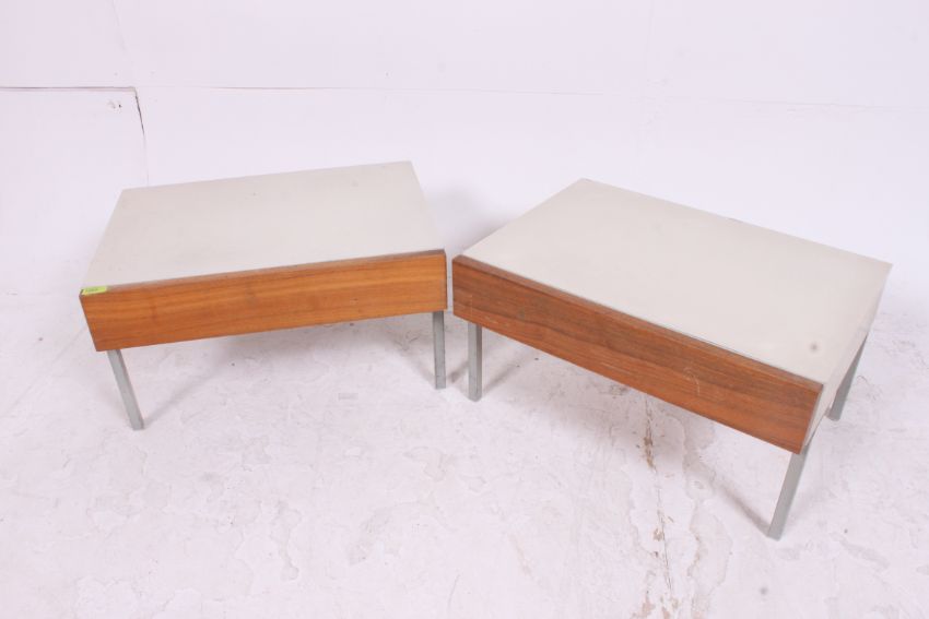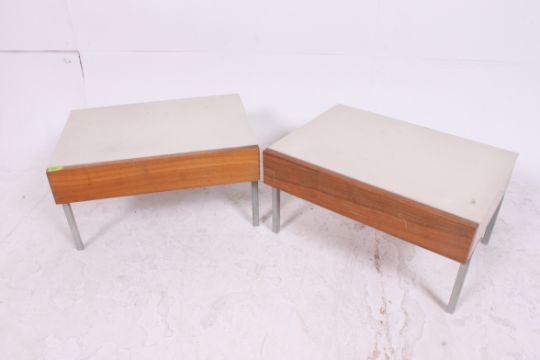 A pair of original 1960's retro Opus 22 bedside cabinets by Stag furniture. Raised on squared tubular metal frames with single drawers atop to each
